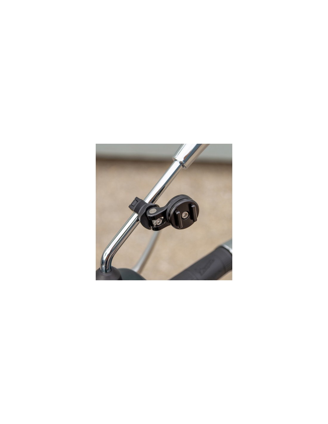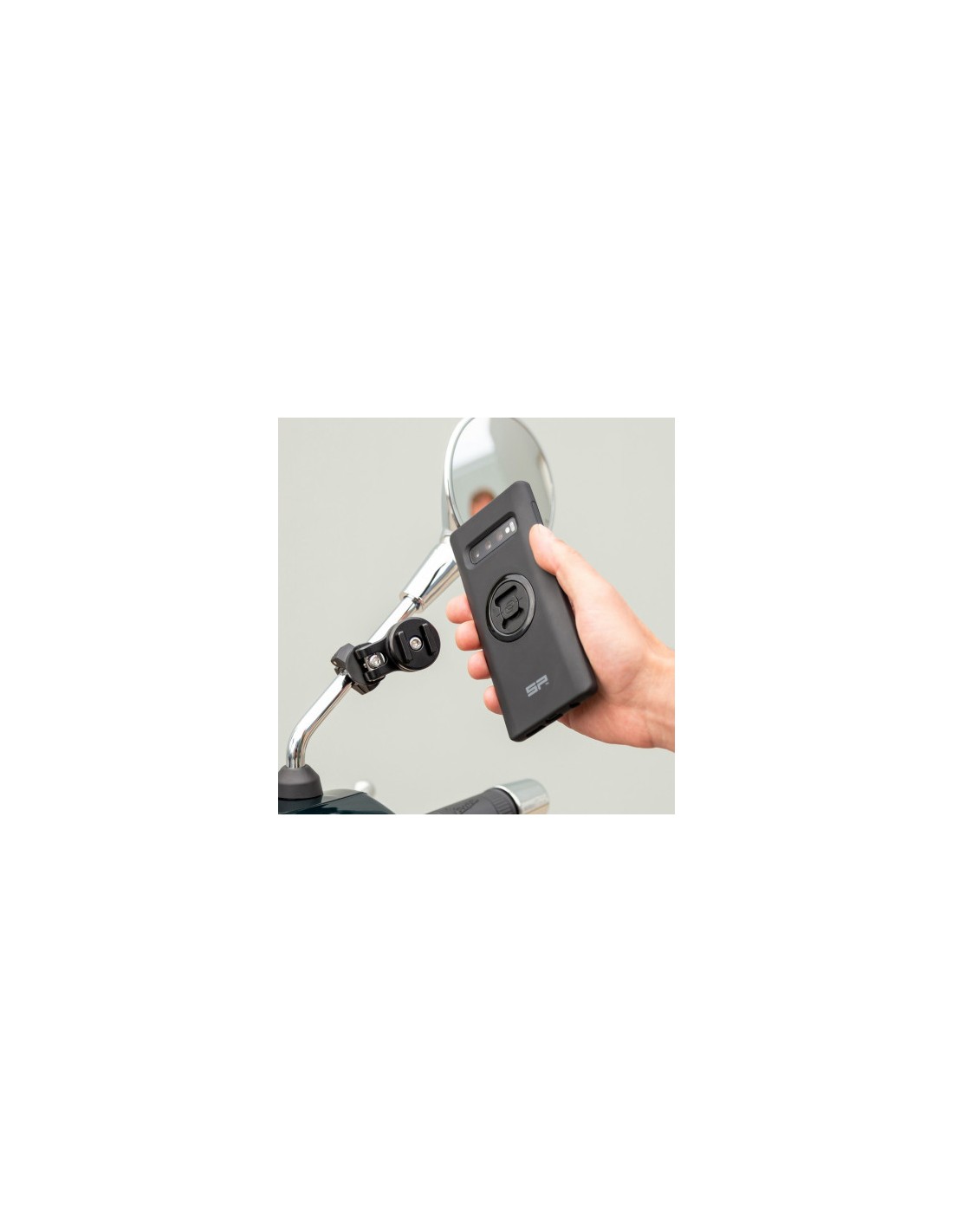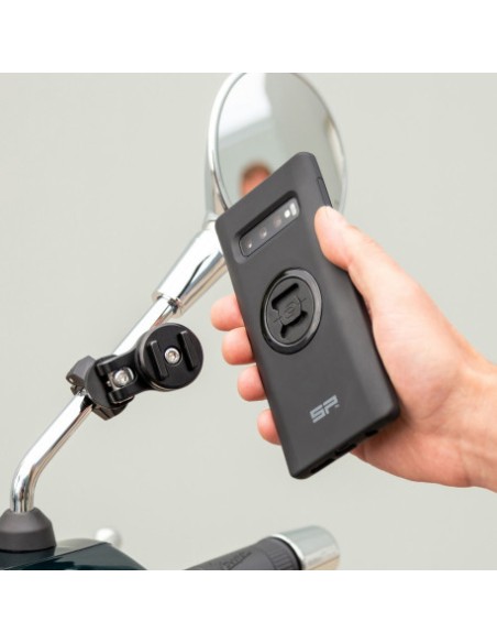 Simplemente fije el MIRROR MOUNT PRO en un espejo de su scooter o barra transversal del manillar de su motocicleta y estará listo para montar el la Funda para SmartPhone de SP Connect o Soporte UNIVERSAL colocándolo en el soporte y girándolo 90 ° en el sentido de las agujas del reloj.