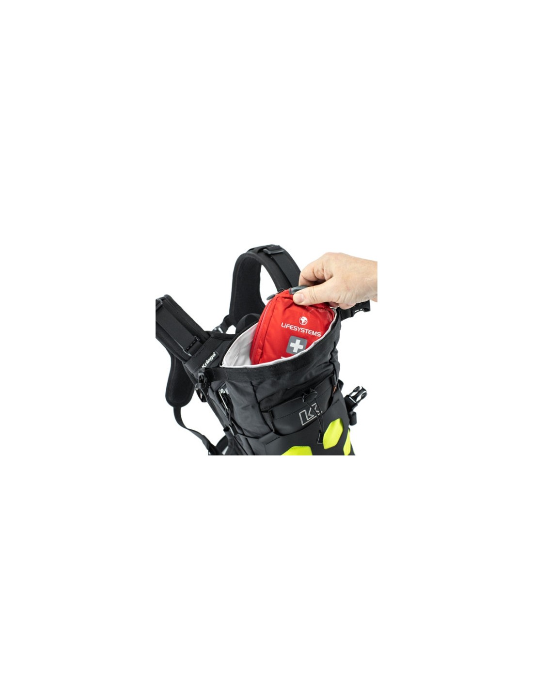 Compuesta de tres secciones: un compartimento trasero de 7 litros con acceso con cremallera para almacenamiento pesado como un porta herramientas, una botella de agua o el depósito de hidratación opcional de 3,75 litros. Esta área también tiene un pequeño bolsillo interno impermeable para un teléfono y la cartera, combinado con el cuerpo principal con cierre enrollable que proporciona un total de