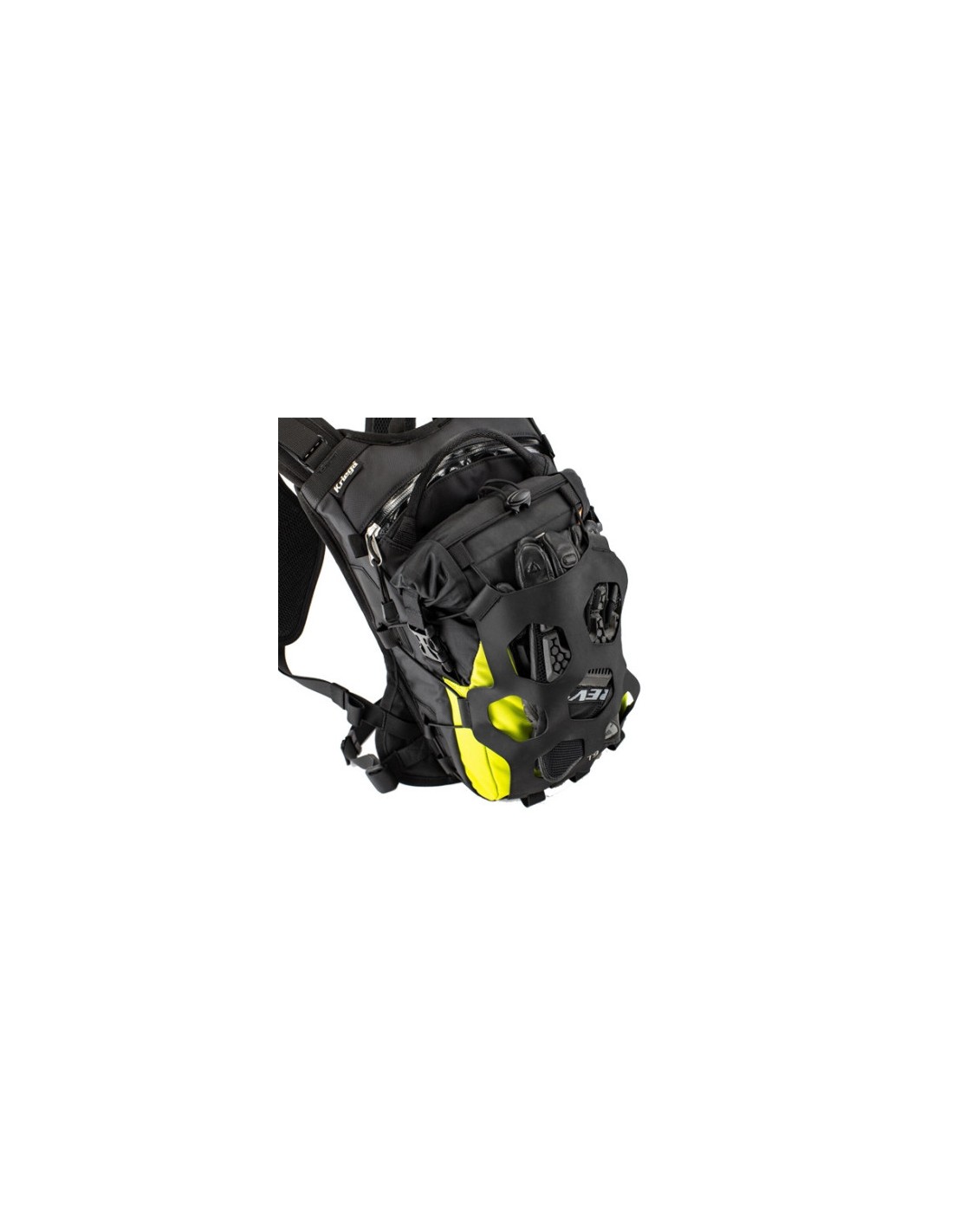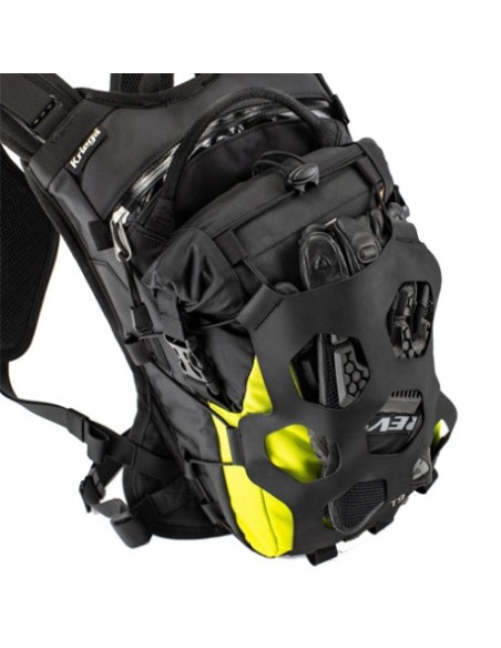 Compuesta de tres secciones: un compartimento trasero de 7 litros con acceso con cremallera para almacenamiento pesado como un porta herramientas, una botella de agua o el depósito de hidratación opcional de 3,75 litros. Esta área también tiene un pequeño bolsillo interno impermeable para un teléfono y la cartera, combinado con el cuerpo principal con cierre enrollable que proporciona un total de 12 litros de almacenamiento 100% impermeable. La innovadora red de Hypalon también proporciona más almacenamiento externo, por ejemplo, para llevar un impermeable.