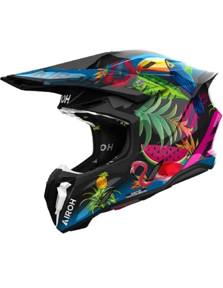 Casco Airoh Twist 3 Amazonia. Casco ideal para los amantes del motocross, su calota está fabricada con resina termoplástica HRT (High Resistant Thermoplastic) de gran resistencia. Incorpora la tecnología ASN (Airoh Sliding Net), y el sistema A.E.F.R. para hacer más fácil la extracción del casco en caso de accidente. Varias entradas y salidas de aire en la parte superior, mentonera y mandíbula para una mejor