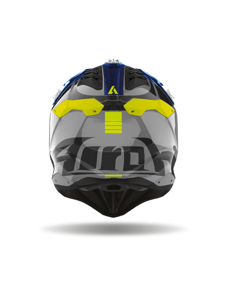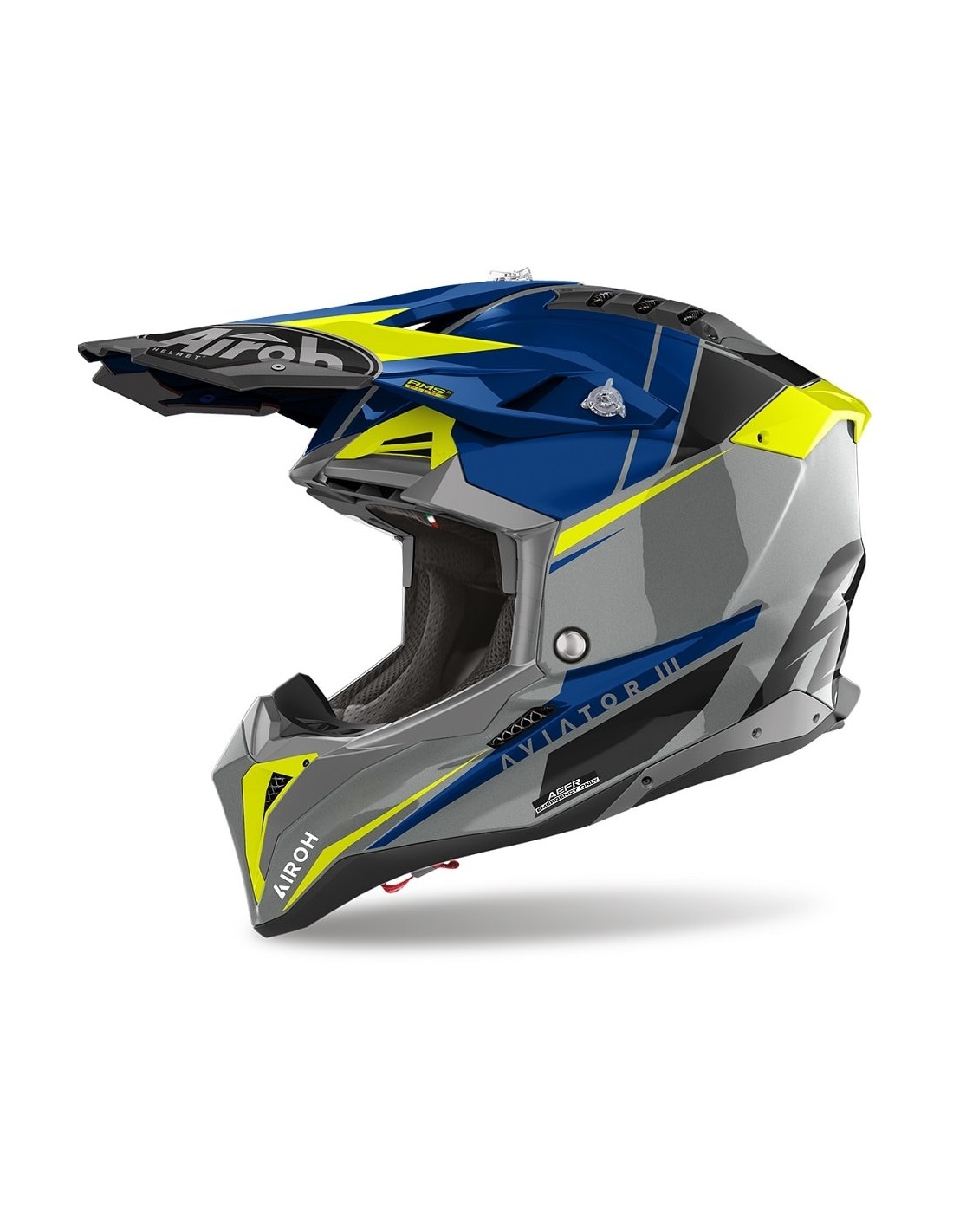 Casco Airoh Aviator 3 Push Azul. Se trata de la última versión del mítico Aviator. El casco definitivo para offroad es ahora aún mejor. Airoh evoluciona su exitoso casco top de gama y dota al Aviator 3 de los últimos avances tecnológicos. Se caracteriza por incorporar el sistema de protección AMS2 (Airoh Multiaction Safety Sistem), el Sistema A.M.L.S (acolchados interiores con enganche magnético) y dispone del sistema A.E.F.R (Airoh Emergency Fast Remove). Se ha prestad