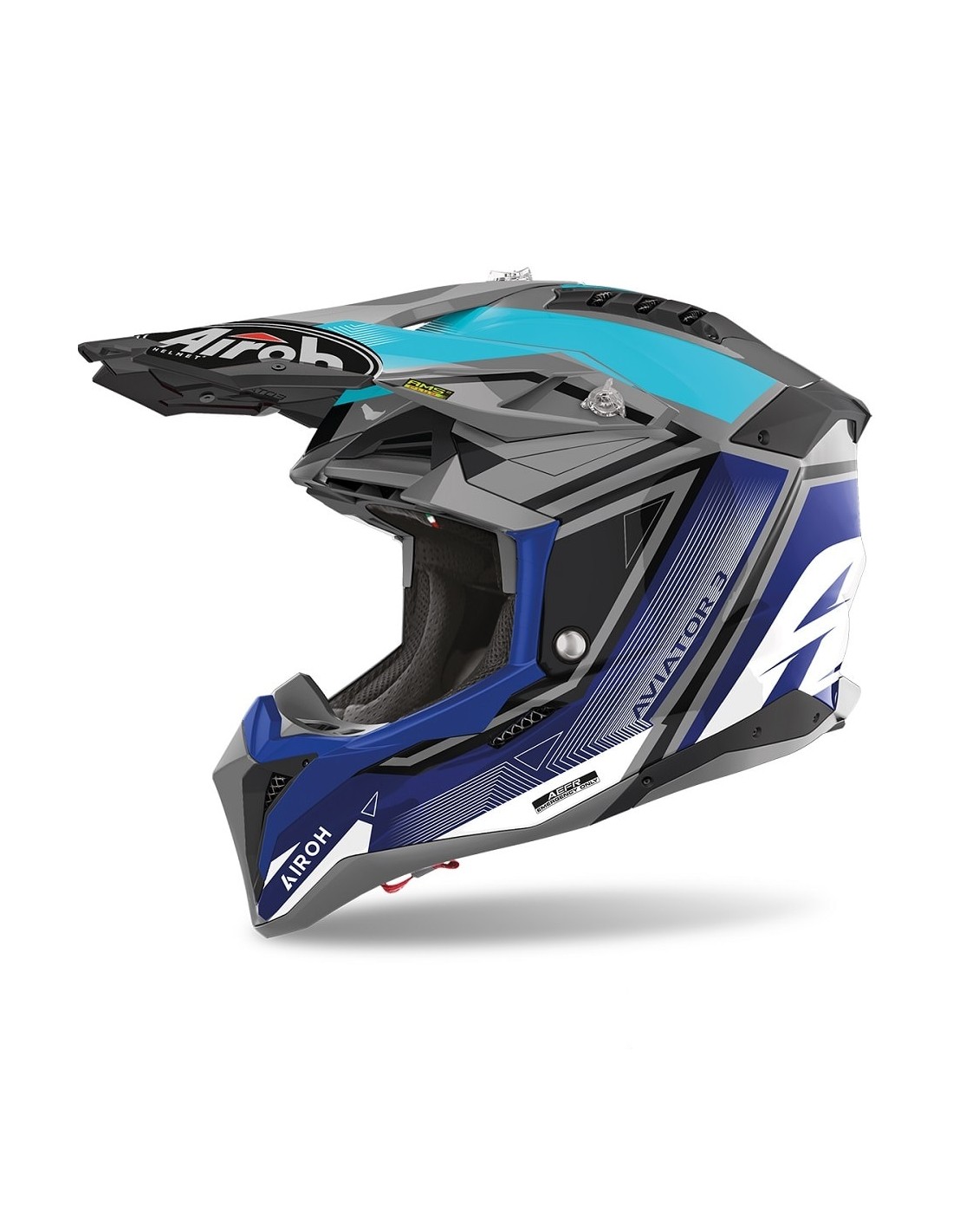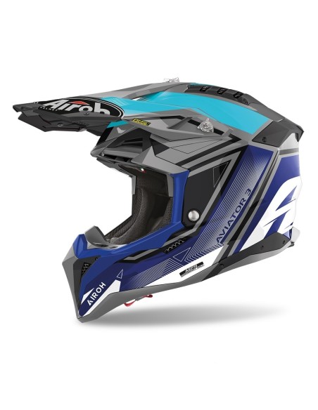 Casco Airoh Aviator 3 League Azul. Se trata de la última versión del mítico Aviator. El casco definitivo para offroad es ahora aún mejor. Airoh evoluciona su exitoso casco top de gama y dota al Aviator 3 de los últimos avances tecnológicos. Se caracteriza por incorporar el sistema de protección AMS2 (Airoh Multiaction Safety Sistem), el Sistema A.M.L.S (acolchados interiores con enganche magnético) y dispone del sistema A.E.F.R (Airoh Emergency Fast Remove). Se ha prest